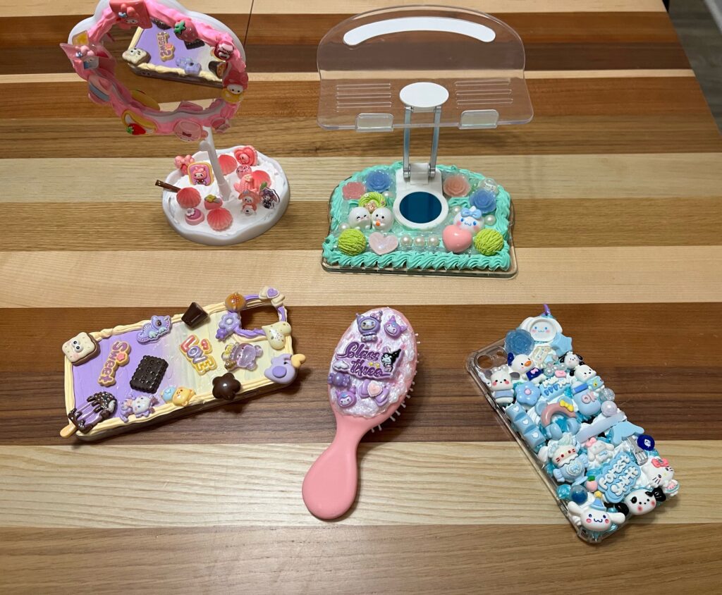 お店にはずらっとかわいいデコレーションパーツが並んでいて、娘たちも大喜び。デコレーションパーツを選んで、クリームと口金も選んでデコレーションしました。長女とAさんは携帯ケース、私はiphoneスタンドのデコレーションをしましたが、次女はブラシのデコレーションがすぐに終わってしまったので、鏡も作り、こどもたちも大喜びでした。ここはこどものお誕生日会にも人気のようで、私たちがいる間にも2組のお誕生日会が入れ替わり行われていました。私たちは今回はクリームデコレーションをしましたが、そのほかにもこのお店では、布に糸を埋め込むタフティング、ガラスに絵を描くglass painitingやキャンドル作り、などいろいろなクラフトができるようで楽しそうです。